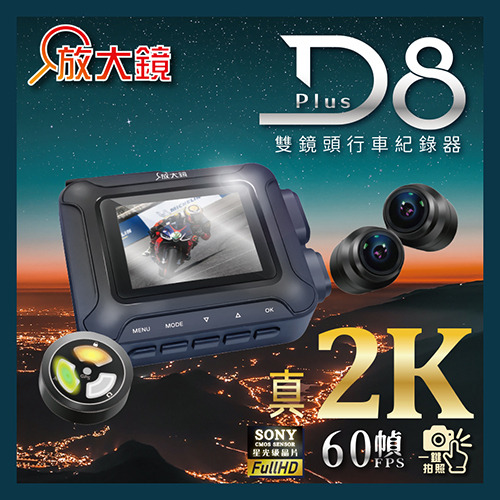D8 2K 60fps 超值款,屬於高階頂規機種,結合高解析度與高幀率錄影技術,提供更細膩且流暢的行車影像,是追求高品質紀錄的進階騎士首選。